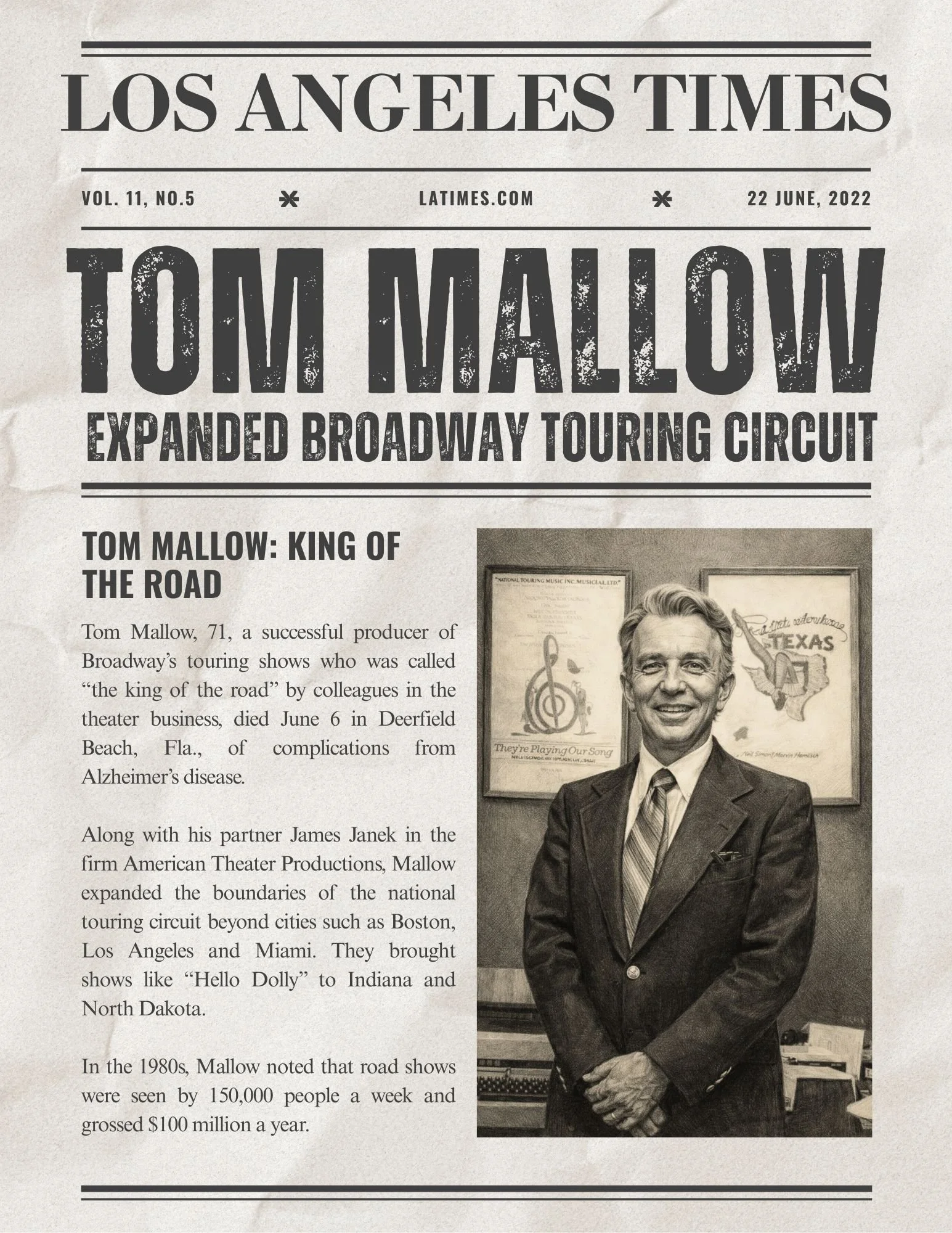 Tom and Jan Mallow co-founded Janco, helping pioneer national touring and laying the groundwork for the modern touring industry. Tom was named by Time magazine as the “King of the Road,” and his legacy continues to thrive through the people, partnerships, and work that carry it forward today.